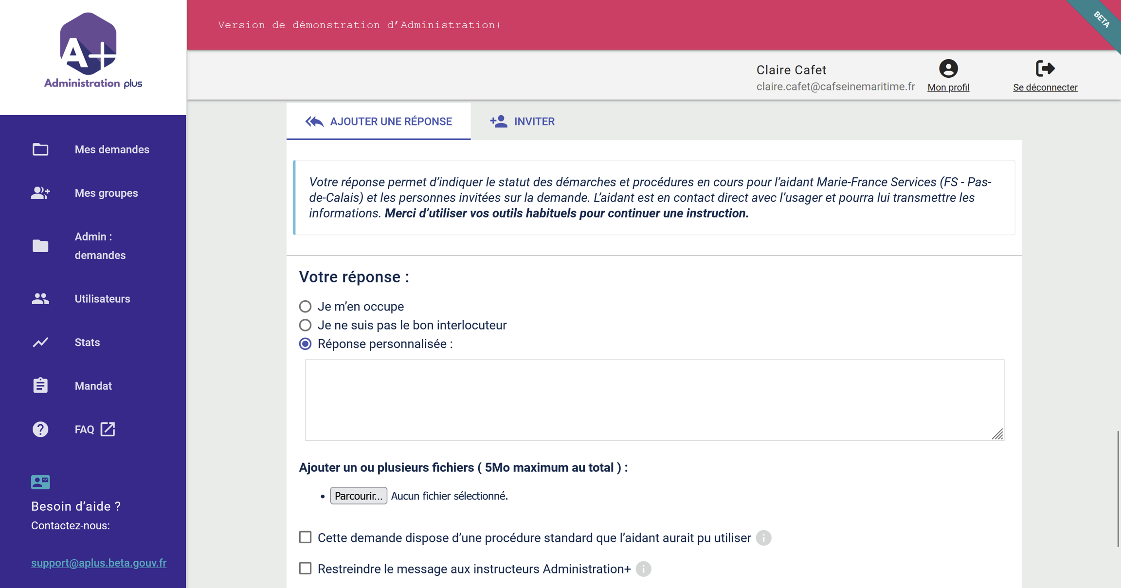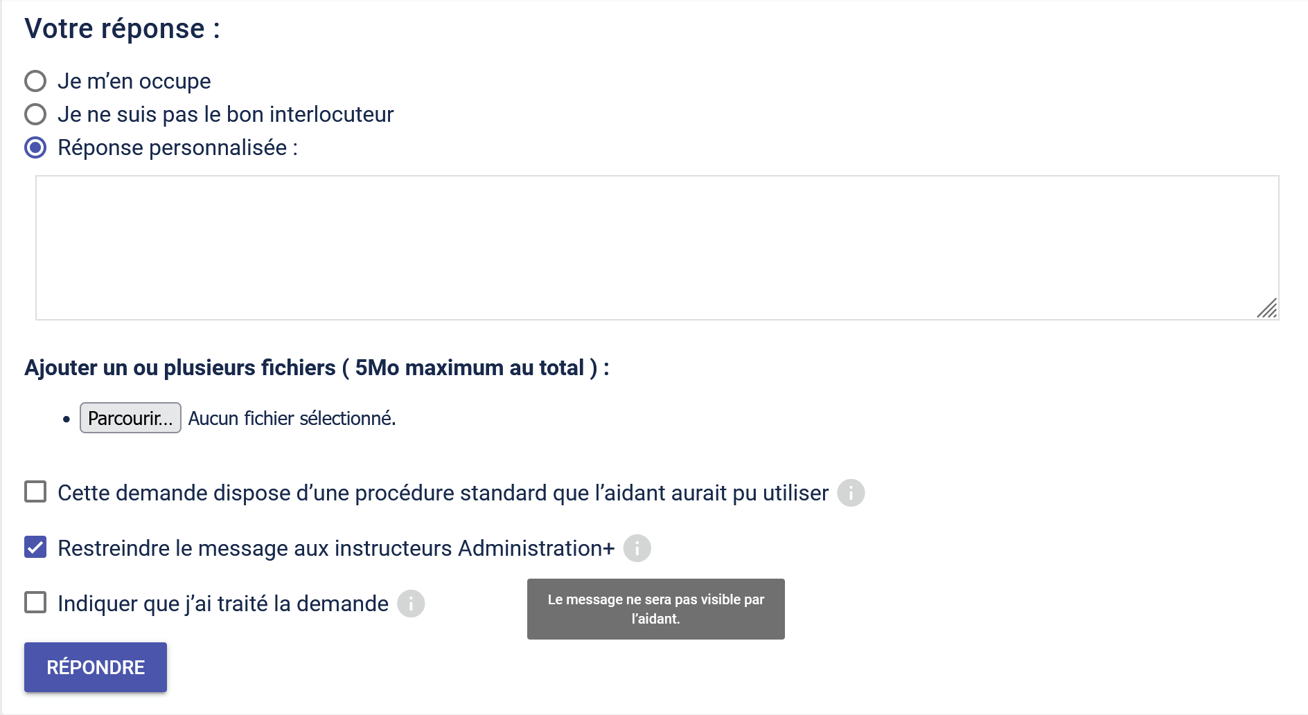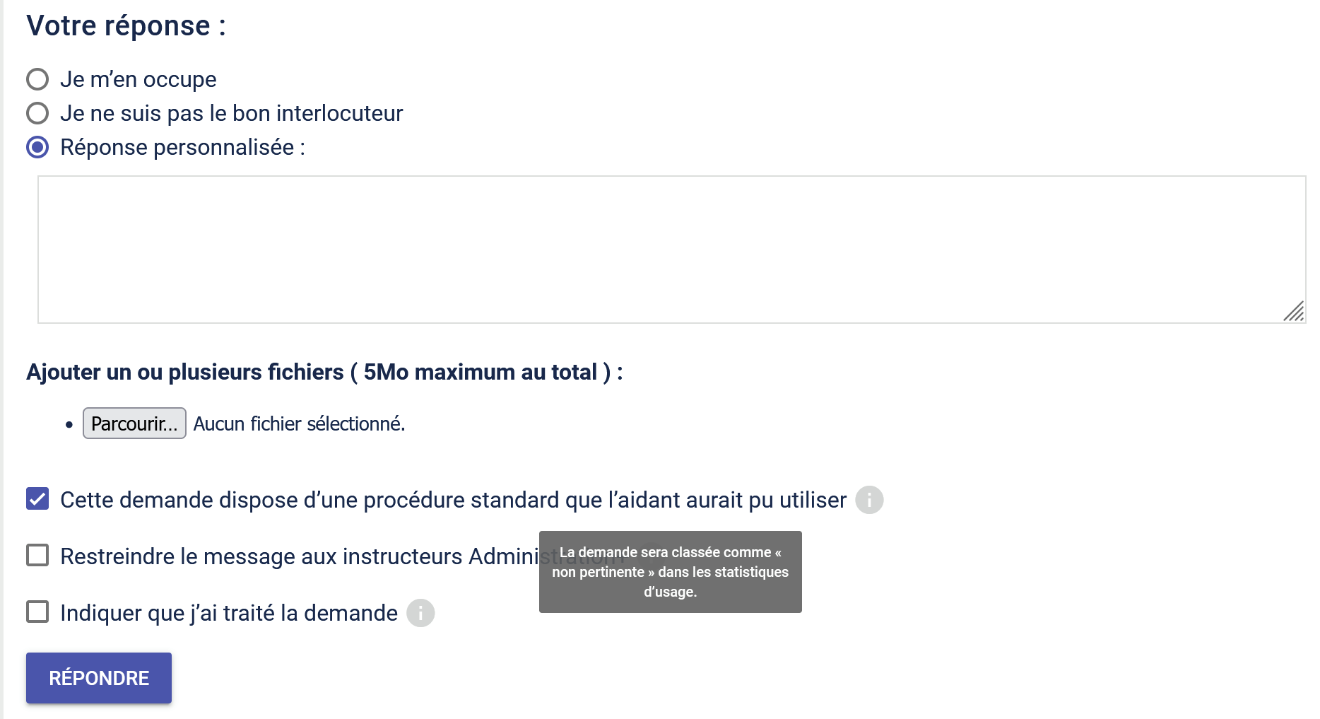 Si la demande ne concerne pas un blocage ou qu’une procédure standardisée existe déjà, cochez la case correspondante et indiquez quelle est la procédure à suivre hors A+ dans l’espace “Réponse personnalisée”.