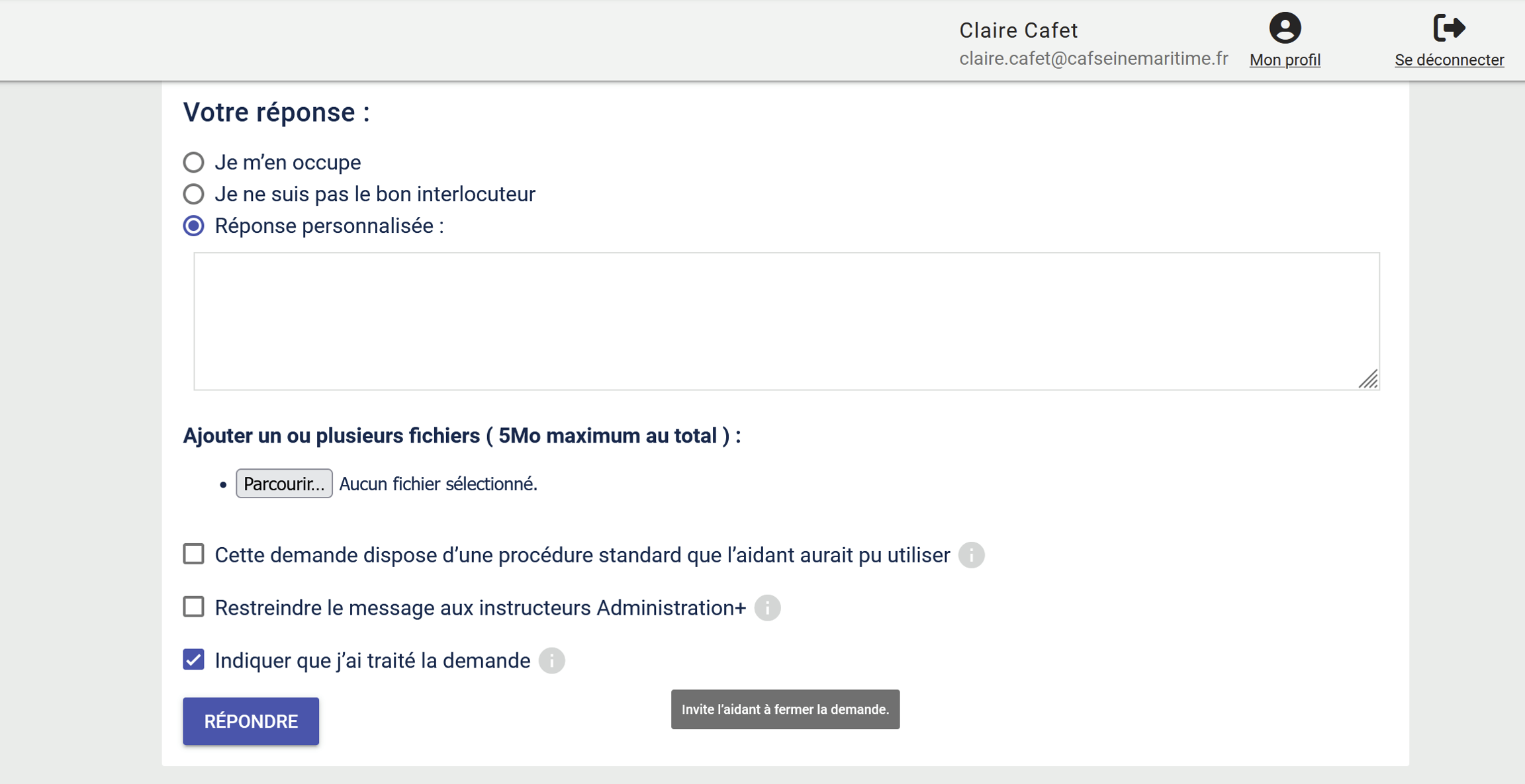 Une fois que vous avez fait votre investigation, vous pouvez répondre à l’aidant pour lui demander des informations complémentaires (dans l’espace Réponse personnalisée) ou lui signaler que votre réponse est votre dernière et que le blocage a été résolu en cochant la case correspondante.