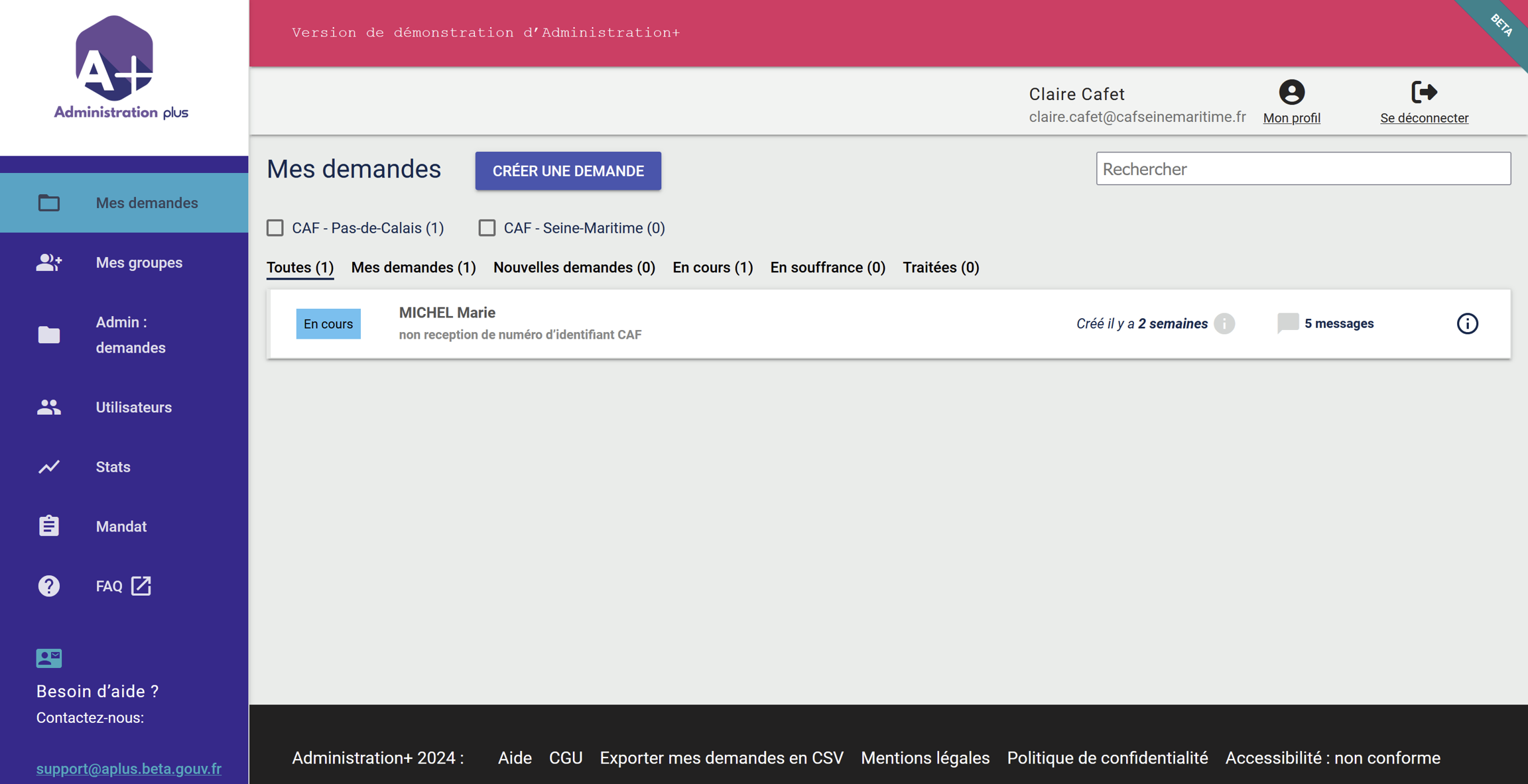L’écran d’accueil d’Administration+ présente toutes vos demandes en cours.