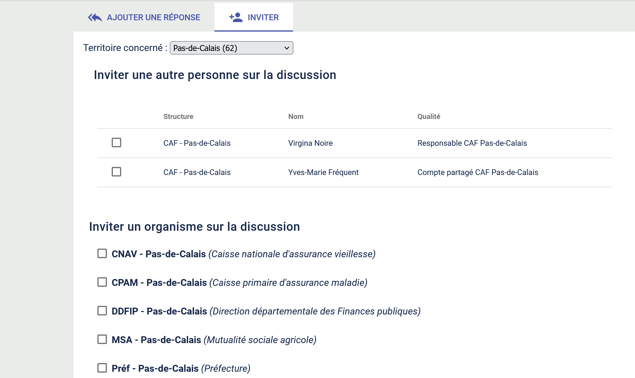 Enfin, vous pouvez inviter d’autres instructeurs ou organismes sur la demande pour la transférer, par exemple, à un organisme compétent. Votre territoire est automatiquement sélectionné mais vous pouvez le changer si besoin.